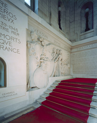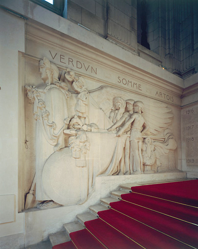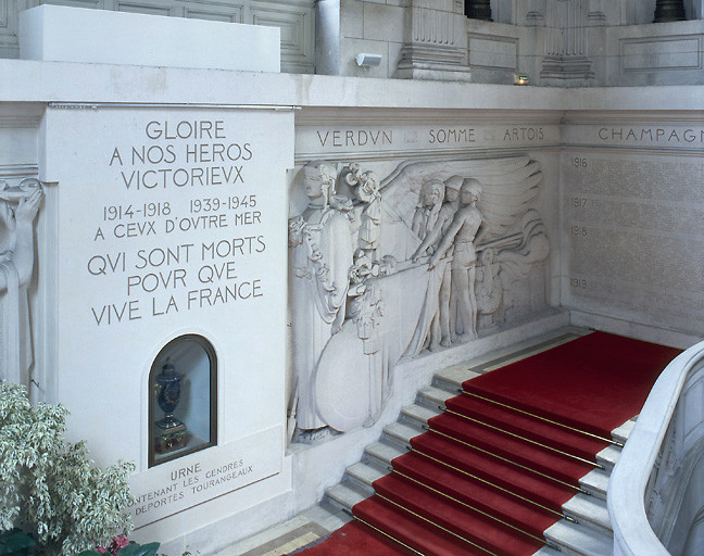 Monument pariétal placé sur le mur nord de la cage du grand escalier avec des retours sur les murs est et ouest ; 2 hauts-reliefs sur le mur nord encadrent une niche ; les retours est et ouest portent les noms des victimes