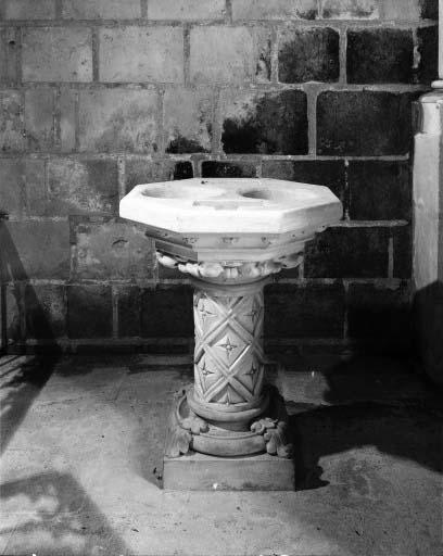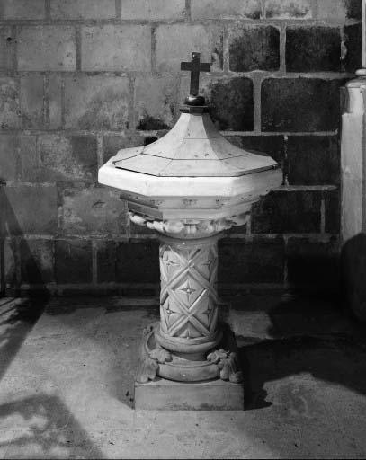 Fonts baptismaux en pierre calcaire blanche à cuve octogonale. Fermés par un couvercle en bois octogonal sommé d'une croix en bois peint. Pied cylindrique sculpté de carrés ornés d'une étoile à quatre branches et d'un cercle au centre. L'espace consacré aux fonts baptismaux est clos au moyen d'une grille en métal de style néo-gothique.