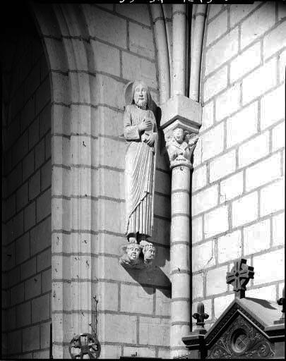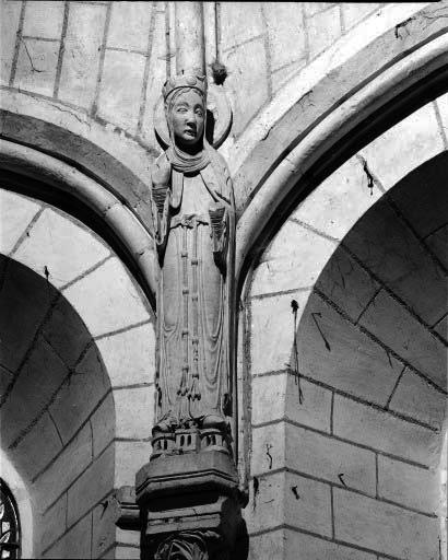 Les quatre statues de l'abside, placées à la retombé des nervures encadrant les trois baies du choeur, sont du dernier quart du 12e siècle (datation par travaux historiques). Il est vraisemblable que la statue isolée située aujourd'hui dans le bras sud du transept, ainsi que celles placées dans des niches à la façade occidentale, soient contemporaines. Il pourrait s'agir de statues ayant appartenu à la travée droite du choeur, déplacées lors de sa modification au 15e siècle. Les deux statues en façade, très dégradées, ont été mutilées à la Révolution.