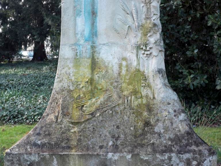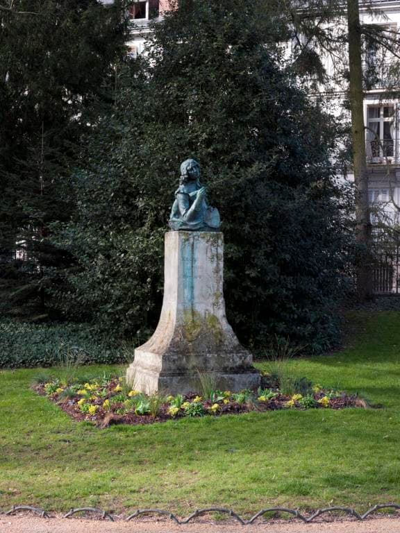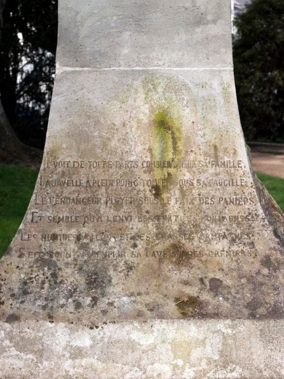 Le buste en bronze est posé sur un haut piédestal en pierre calcaire.