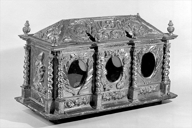 Le couronnement de la châsse formé d'angelots portant des palmes est déposé à la sacristie ; quelques manques sur les bases des colonettes.