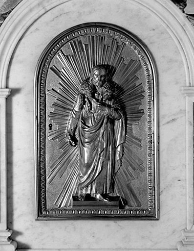 Bon Pasteur sur la porte du tabernacle ; Agneau mystique, palmes, 2 angelots sur le devant d'autel ; 1 angelot aux angles antérieurs du tombeau, 2 au-dessus de la porte du tabernacle, termes angéliques de part et d'autre ; volutes de part et d'autre du tabernacle, du gradin et du thabor.