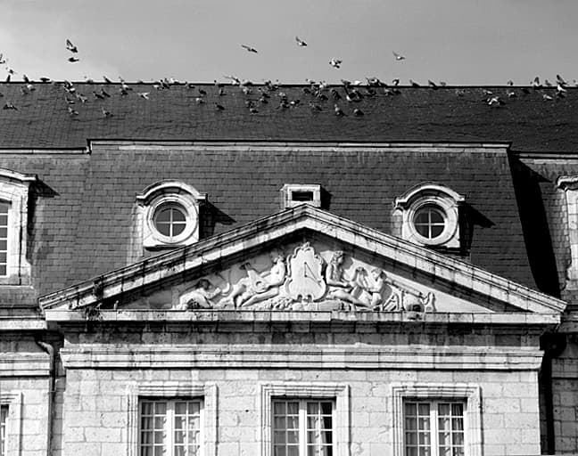 Frontons triangulaires. Un cartouche occupe le centre du fronton est.