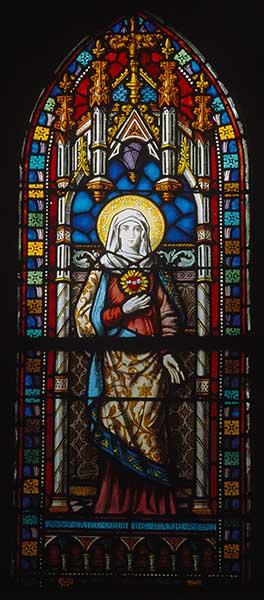 La Vierge se tient debout dans une niche architecturale décorative et présente de sa main droite son coeur enflammé, surmonté d'une croix et entouré d'une guirlande de rose. Une large bordure composé d'un filet à points, de motifs végétaux et de deux filets de scellement enserre l'ensemble de la verrière.