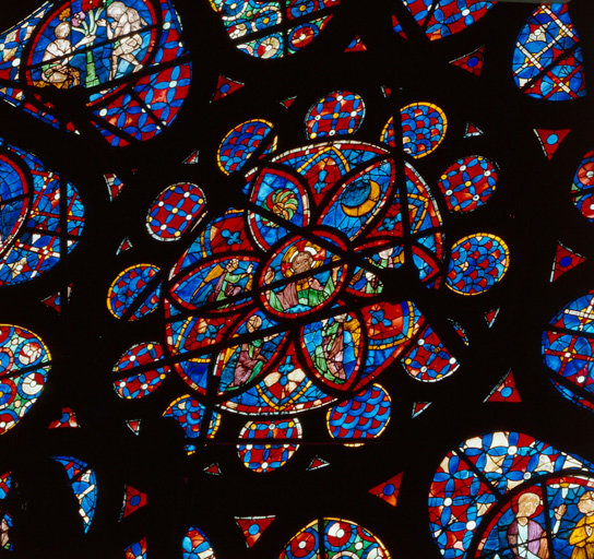 Verrière réalisée vers 1241 dont seulement un tiers des verres est toujours d'origine ; 3 panneaux du 1er cercle datent de 1872 (Caïn tuant Abel, travaux d'Adam et Eve, Adam et Eve au paradis), le premier a remplacé une lapidation de saint Etienne du 15e siècle ou du 16e siècle et les deux suivants ont pris la place de 2 demi-panneaux provenant d'un Arbre de Jessé du 13e siècle ; 2 des 3 anges portant phylactère du 2e cercle sont du 19e siècle ; l'ange thuriféraire se trouvant en bas et à gauche du Christ de l'oculus central a une tête du 15e siècle ou du 16e siècle posée en 1600.