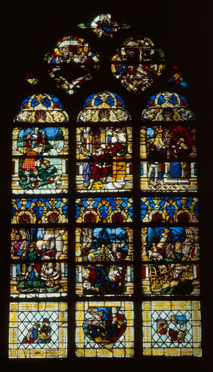 Verrière de la Glorification de la Vierge datée de 1526 attribuée à Mathieu Bléville, don de Nicolas Collesson et Marguerite Lalemant, sa femme ; le panneau de la Dormition de la Vierge (registre inférieur) est apparenté à la cathédrale de Châlons-sur-Marne (51), et celui du Couronnement de la Vierge s'inspire de la fameuse suite de la Vie de la Vierge gravée par Albert Dürer et publiée en 1510.