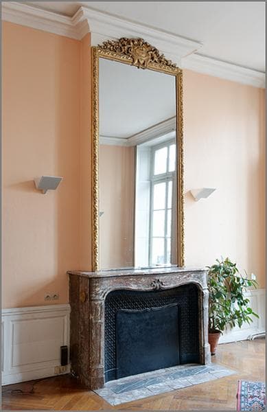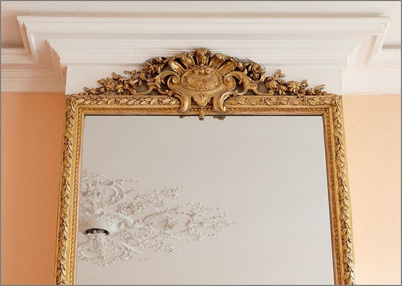 lambris d'appui ; cheminée ; glace de trumeau ; plafond ; porte ; parquet