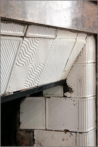 Cheminée engagée ; manteau en marbre veiné gris, brun ; piédroits de type toscan ; rétrécissement ébrasé en carreaux de céramique blancs ornés de cannelures (verticales ou de biais) et d'ondulations ; jouées peintes en blanc