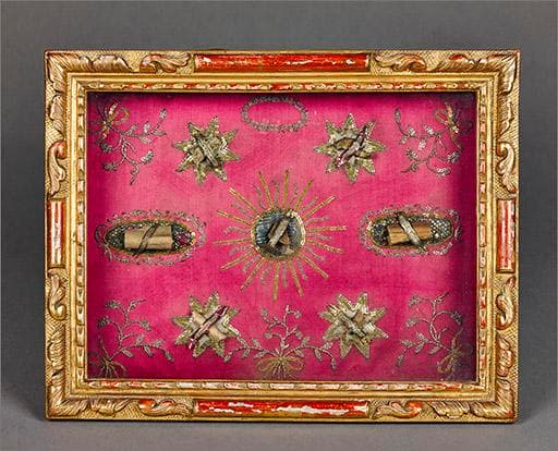 Ensemble de deux tableaux-reliquaires bordés d'un cadre en bois orné de reparures (palmettes sur fond losangé) et doré à la feuille sur bol d'Arménie. Sept reliques (fragments d'os) et des motifs végétaux brodés au fil d'or (avec application de paillons argentés, dorés et rouges) sont disposés sur un fond en soie rouge selon une composition symétrique organisée autour d'un motif central de soleil sur lequel est appliquée la relique de saint Mansuy ; chaque relique, maintenue par une étiquette en papier sur laquelle figure le nom du saint en latin, étant posée sur un élément rapportée de forme étoilée ou ovale (soleil pour saint Mansuy), en tissu (reps de soie blanche pour les étoiles, tissu lamellé pour le coeur du soleil, tulle à l'aiguille pour les ovales) enrichi de perles ou paillon.