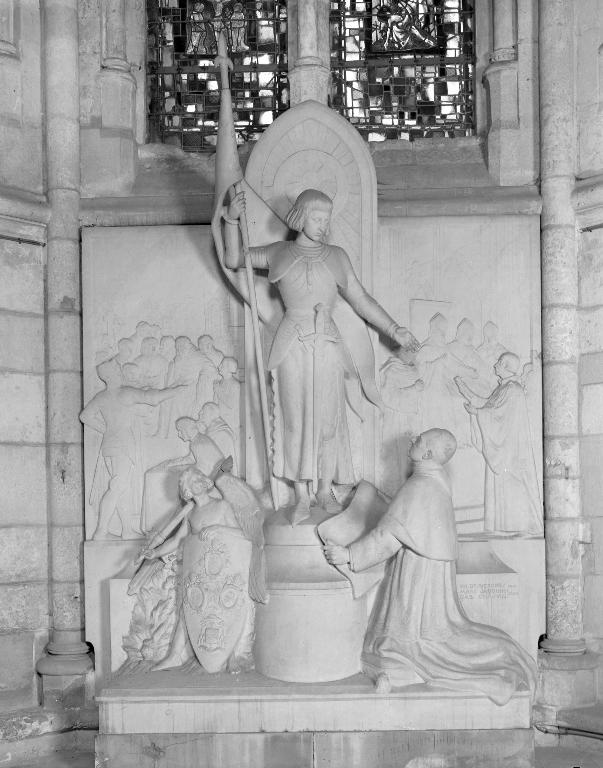 Sur le haut-relief central, l'évêque de Beauvais, Monseigneur Le Senne, demande pardon à sainte Jeanne d'Arc pour le crime de son prédécesseur Cauchon. Un ange, à gauche, présente les armes de trois papes et d'un cardinal. Sur le bas-relief latéral gauche la condamnation de sainte Jeanne d'Arc est représentée, tandis que la bas-relief latéral droit représente sa réhabilitation.
