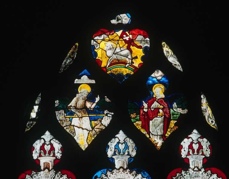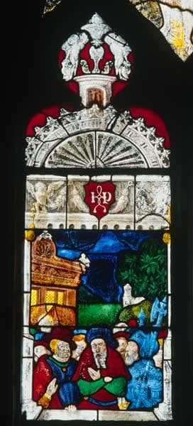 verrière hagiographique : Salomé portant la tête de saint Jean-Baptiste, danse de Salomé devant Hérode Antipas, supplice de saint Jean l'Evangéliste