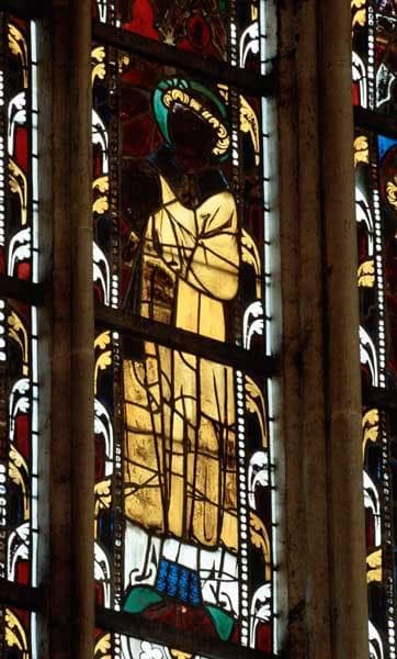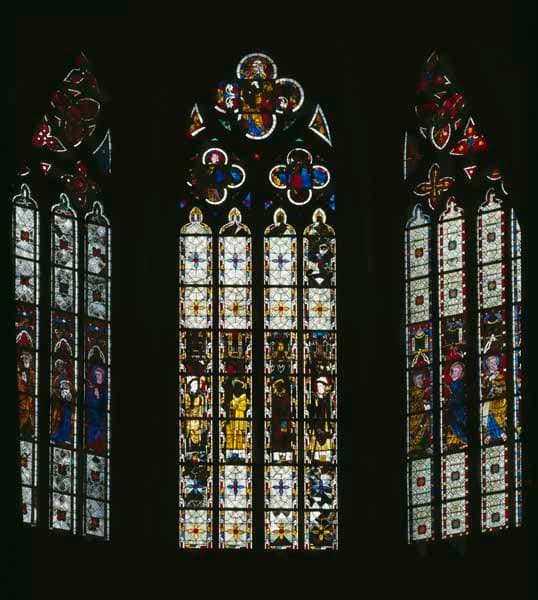 verrière hagiographique : saint Latuin, saint Gervais, saint Protais, saint Chrodegand, sainte Anne, Vierge