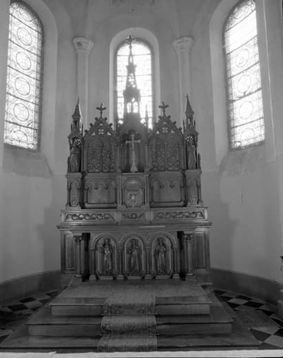 3 autels, banc de choeur, chaire à prêcher, confessionnal, fauteuil de célébrant, 2 retables, tribune