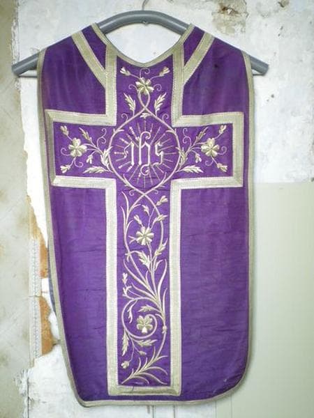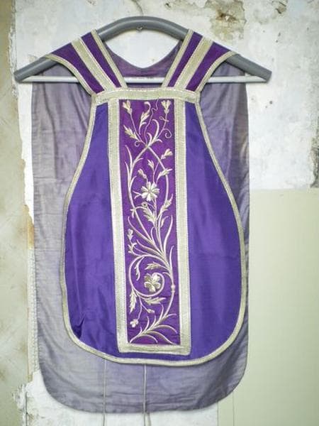 Ensemble (chasuble, étole, étole pastorale, deux manipules, voile de calice, bourse de corporal) de moire violet, brodé de fils d'argent.