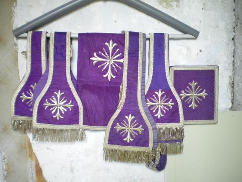 chasuble, 2 étoles, 2 manipules, voile de calice, bourse de corporal (ornement violet)