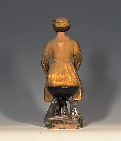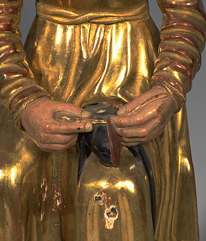 Statuette monoxyle (?), peinte (polychrome) et dorée (vêtements). Socle en plusieurs éléments : terrasse oblique de plan ovale, peint en faux-marbre brun taché de noir.