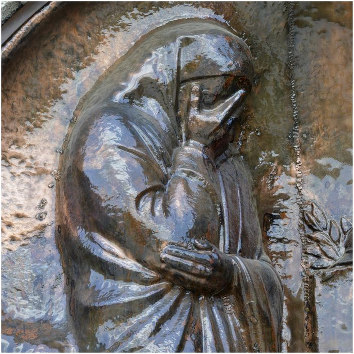 Mur formant socle supportant fronton en demi-cercle en granite orné d'un haut-relief en bronze ; deux portes latérales métalliques ornées de deux bas-reliefs chacune de Format carré en métal martelé et peint ; lettrage en bronze ; plaques d'inscription en marbre