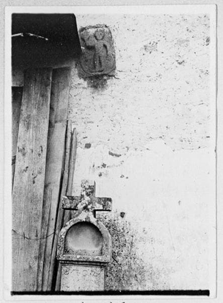 Pierre remployée dans le mur est, sculptée en relief peu saillant d'une figure humaine.
