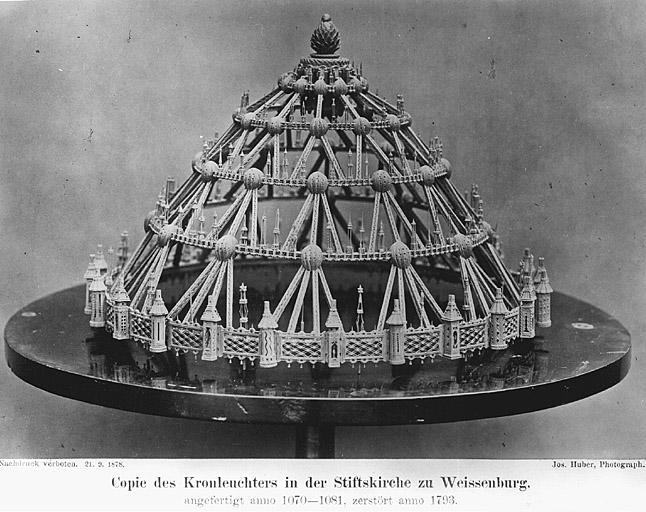 Reproduction réduite du célèbre lustre couronne roman en fer forgé, de 6 mètres de diamètre qui fut offert par l'abbé Samuel à l'abbatiale, suite à un voeu. Ce lustre, réalisé de 1070 à 1081, resta en place dans l'église jusqu'en 1793, date à laquelle il fut détruit sur ordre du représentant du peuple, Dentzel. Jean Balthasar Boell (1746-1815), bourgeois de Wissembourg, qui était sellier, brasseur et tonnelier et qui avait des dons de sculpteur, avait commencé vers 1780 et poursuivi pendant une dizaine d'années la réalisation de la maquette du lustre. Elle passa par héritage à sa fille et fut acquise, en 1880, dans le midi, par Joseph von Stichaner (Kreisdirektor de Wissembourg) qui en fit don à la ville.