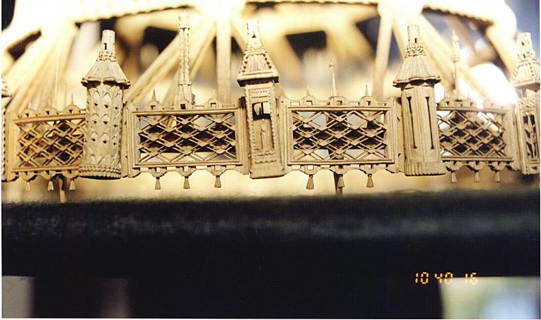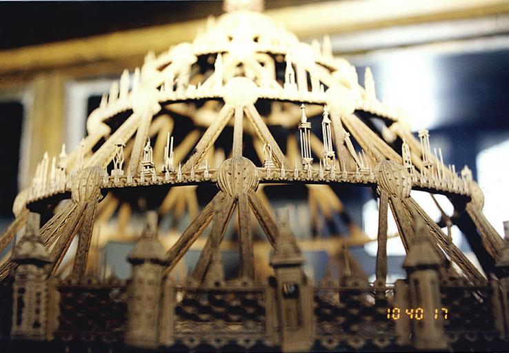 Maquette de lustre couronne réalisée dans un seul bloc de bois (variété de cerisier) évidé, ajouré et sculpté. Le lustre comporte 5 couronnes superposées, de taille décroissante. Celle du niveau inférieur reproduit une enceinte de ville (Jérusalem céleste) avec 24 tours rondes et carrées ; dans chacune des tours carrées est située une figurine d'apôtre. Les 4 couronnes suivantes portent des pinâcles et 348 broches pour les chandelles. Le sommet est formé par une pomme de pin.