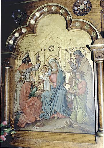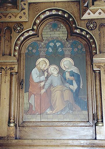 Retable sud : saint Louis de Gonzague, saint Joseph et l'Enfant, saint Michel terrassant le dragon ; scènes peintes : Fuite en Egypte, Mort de saint Joseph, Jésus dans l'atelier de Joseph. Retable nord : sainte Elisabeth de Hongrie, Vierge à l'Enfant, sainte Odile ; scènes peintes : Adoration des rois mages, Couronnement de la Vierge, Annonciation.