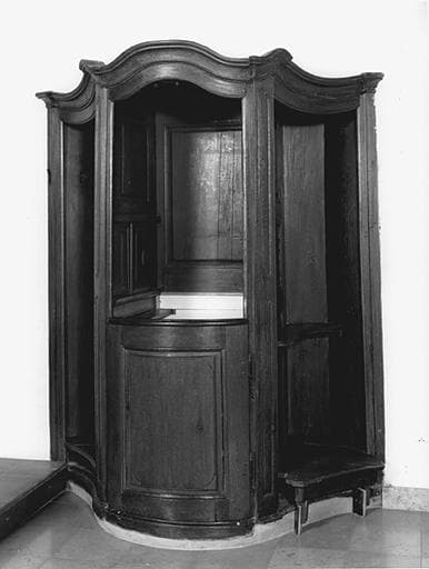 Confessionnal de plan chantourné, droit en élévation ; panneaux moulurés sur les angles, bordés de tores aux extrémités en volutes affrontées ; corniche moulurée, à ressauts. Agenouilloirs mobiles ; tablettes intérieures découpées. Fiches en fer forgé.