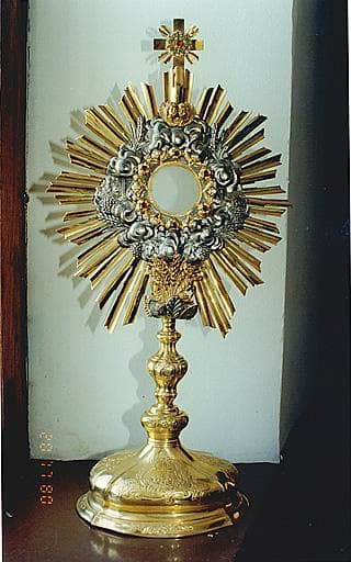 Pied en cuivre entièrement repoussé et ciselé ; tige fondue ; nuées au décor repoussé, en partie rapporté (angelots et couronne centrale).