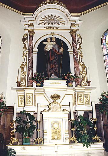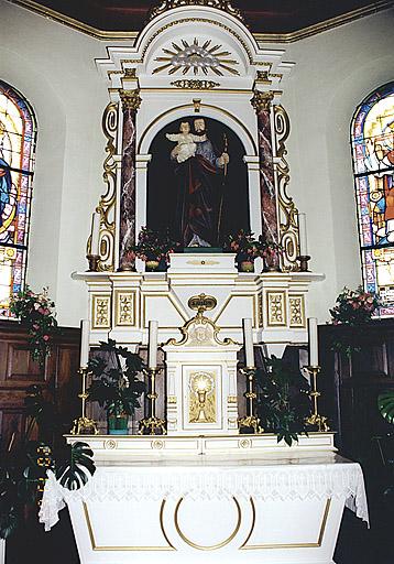Autel évasé, tabernacle droit en élévation, retable à deux colonnes (peintes faux marbre), encadrant une niche cintrée recevant la statue de saint Joseph et l'Enfant.