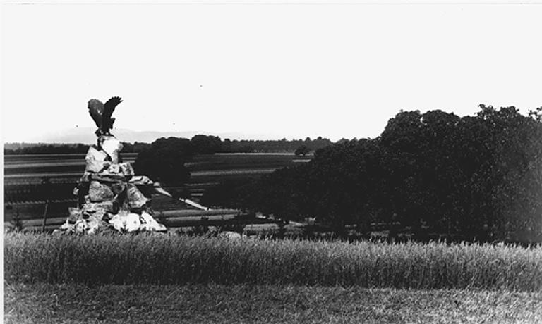 Monument élevé en 1899 (travaux historiques) à la mémoire des défunts du 2e régiment d'infanterie de Thuringe, n. 32, tombés en 1870 et 1871. L'aigle a été fondu dans l'atelier dit Aktien Gesellschaft, autrefois H. Cladenbeck et fils à Berlin (signature au revers de l'aigle). A l'origine ce monument était entièrement dégagé au sommet de la colline, aujourd'hui il est entouré d'arbres qui le cachent.