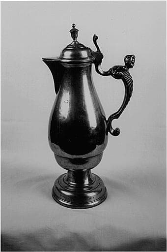 La panse piriforme est soudée sur une sorte de culot de diamètre inférieur, s'articulant sur le piédouche. Sur le col est assemblé à chaud un bec assez massif obturé par un triangle solidaire du couvercle. Ce dernier est sommé d'une sorte d'urne servant de prise. L'anse à volutes est agrémentée d'une tête d'ange.
