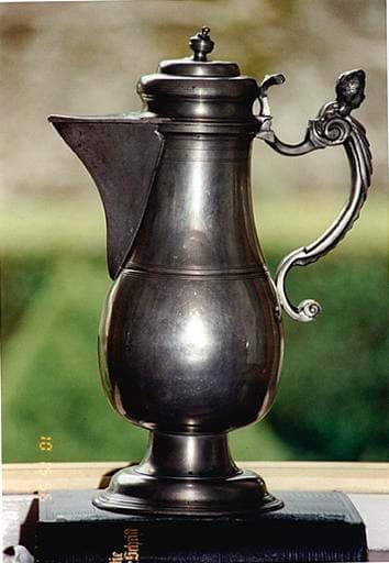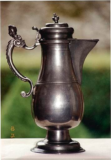 Sur un piédouche mouluré, cruche dont le col est séparé du bord supérieur et de la panse par une mouluration (la panse a été soudée au col au niveau de la mouluration) et dont le couvercle, mouluré, est sommé par un élément de préhension et soudé à une plaque triangulaire couvrant un imposant bec verseur. A l'opposé de ce dernier, l'anse en forme de volutes présente une tête et le couvercle est doté d'un appui-pouce à extrémité feuillagée.