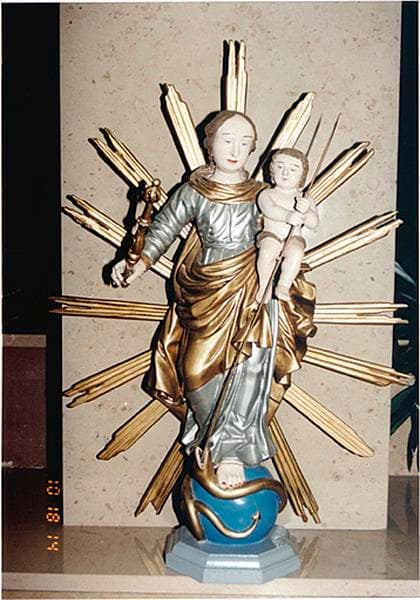 Statue combinant les thèmes de la Vierge à l'Enfant et de la Vierge de l'Immaculée Conception : tenant un sceptre rapporté de la main droite, elle porte sur son bras gauche l'Enfant rapporté qui tue d'une lance le serpent lové sur le globe sur lequel se tient la Vierge. Son revers évidé est caché par la gloire rapportée qui se compose de faisceaux de rayons fixés à une planche en forme d'amande, gravée de rayons, au centre de laquelle est rapportée une tête circulaire sculptée en bas relieffigurant un soleil.