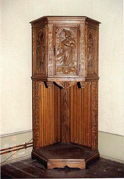 Ce meuble n'a pu être ouvert. De plan hexagonal irrégulier, il présente une partie supérieure fermée, ornée de panneaux sculptés en bas relief représentant des allégories de vertus (les têtes sont en partie traitées en haut relief), placées sous un arc, debout sur une terrasse sous laquelle figure un angelot. Le panneau réemployé sur la porte représente la Justice avec l'épée et le globe, celui à droite représente le Courage ou la Force : le personnage féminin extirpe un dragon d'une tour, celui à gauche enfin figure sans doute (de façon inhabituelle) la Foi : personnage féminin tenant une maquette d'église. De part et d'autre de chaque allégorie figurent des ornements végétaux et volutes en frise verticale. Sous la partie fermée sont rapportés un angelot et deux culots feuillagés. La partie inférieure du meuble consiste en une sorte d'exposition avec fond sculpté de tentures et frises verticales géométriques et végétales.