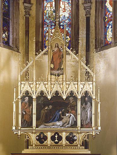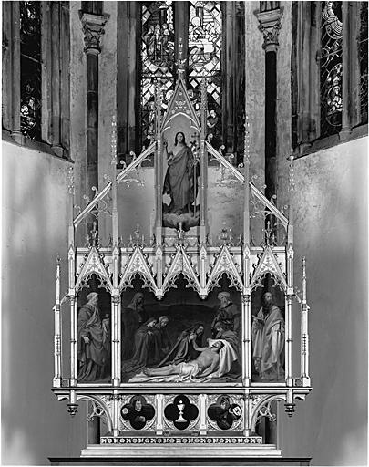 Retable composé d'une prédelle, d'une partie centrale à trois tableaux, surmontée de 5 gâbles et d'un couronnement à un tableau.