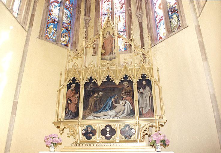 Retable protestant de style néo-gothique, offert en 1876 à la paroisse de Froeschwiller par des donateurs de l'Allemagne du nord, par l'entremise du pasteur S. Nielsen. L'autel est moderne.