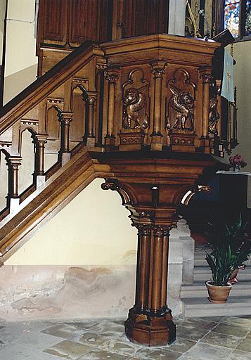 Chaire pastorale réalisée par l'architecte Charles Winkler et le menuisier sculpteur Muller, de Strasbourg, vers 1875, comme plusieurs autres pièces du mobilier de l'église.