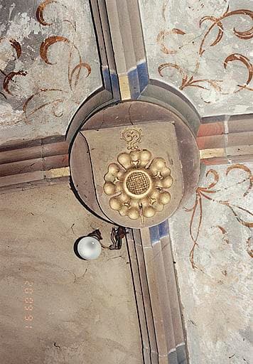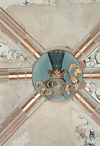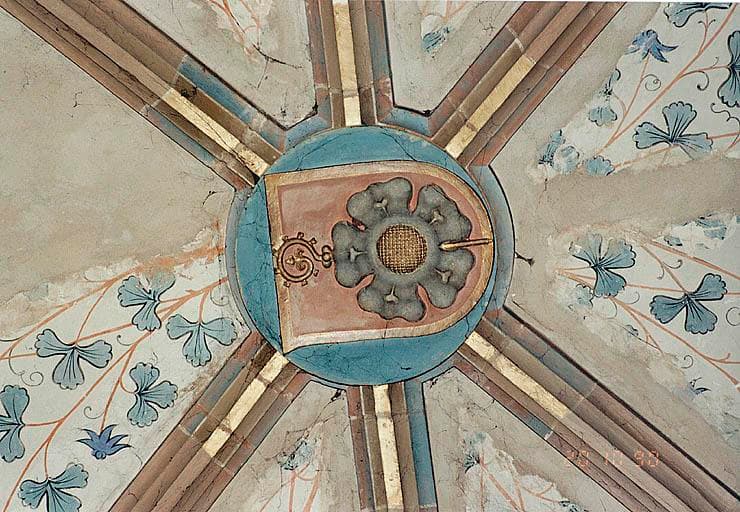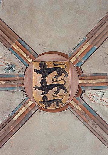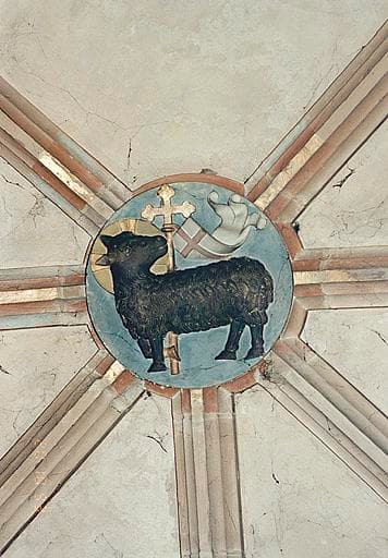 Clés de voûte circulaires, portant cinq écus armoriés et une représentation de l'Agneau de Dieu (quatre clés dans le choeur, deux dans la sacristie).