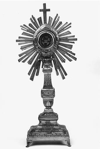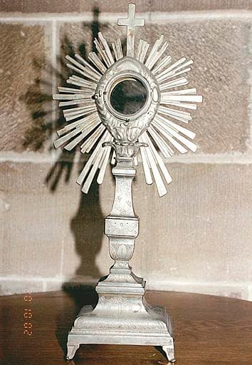 Reliquaire en forme d'ostensoir. Pied rectangulaire, tige en balustre, ouverture circulaire entourée de nuées et d'une gloire. Porte vitrée fermée à l'arrière par un loquet.