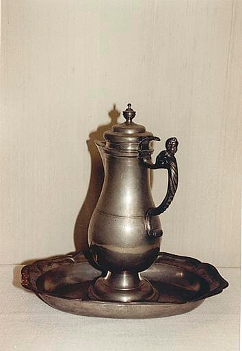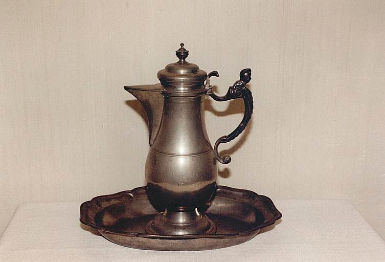 Couvercle mouluré à bouton en forme de toupie et poucier bifide. Anse en volute décorée d'une tête. Panse piriforme et pied circulaire. Bassin de forme ovale à l'aile moulurée chantournée.