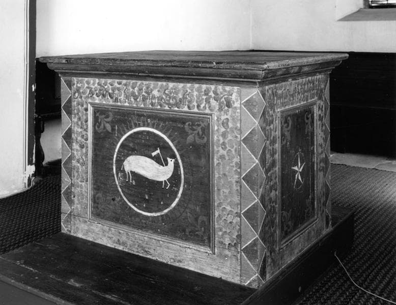 Autel quadrangulaire, à plateau débordant. Les quatre faces à panneaux moulurés et cadres rapportés, sont peintes : décor faux marbre, Agneau sur la face antérieure. A l'arrière, une porte à un battant ; serrure en fer forgé.