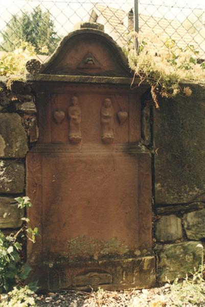 Tombeaux déplacés, encastrés dans le mur de clôture du cimetière. Croix sommitales disparues.