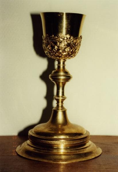 Calice formé de deux éléments différents : le pied et la tige sont en cuivre, au décor rare ; la fausse coupe porte un riche décor de fleurs et de rocailles ; elle est peut-être en argent (le calice n'a pas pu être démonté pour voir les poinçons).
