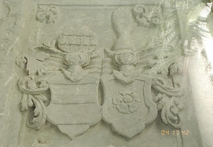 épitaphe (gravée, allemand, alsacien, sur l'oeuvre, partiellement illisible) ; armoiries (en relief, sur l'oeuvre)