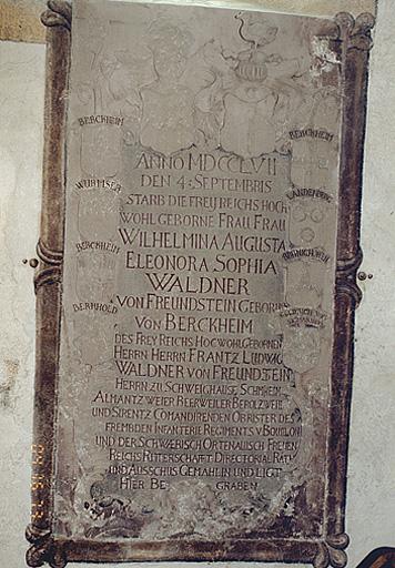Plaque funéraire de Wilhelmina Augusta Eleonora Sophia Waldner von Freundstein née von Berckheim, réalisée au courant du 3e quart du 18e siècle. Elle naquit en 1732 et mourut le 4 septembre 1758, en 1751 elle épousa Frantz Ludwig Waldner von Freundstein (1710-1788). Sa belle-soeur Françoise Bénigne Waldner von Freundstein (1717-1750) avait épousé le comte Ferdinand Eberhard de Sandersleben-Coligny. La plaque funéraire est entourée d'une bordure peinte formant un encadrement et datant probablement de l'époque du scellement. Les inscriptions et armoiries ont été martelées sans doute durant la Révolution. La plaque a fait l'objet d'une restauration entre 1996 et 1997, qui fut menée à bien par l'entreprise colmarienne Schické.