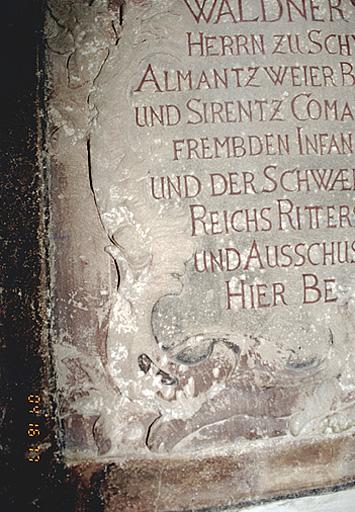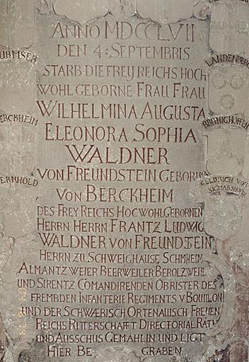 Transcription de l'épitaphe : ANNO MDCCLVII / DEN 4 : SEPTEMBRIS / STARB DIE FREYREICHS HOCH/WOHL GEBORNE FRAU FRAU / WILHELMINA AUGUSTA / ELEONORA SOPHIA / WALDNER / VON FREUNDSTEIN GEBORNe / VON BERCKHEIM / DES FREY REICHS HOCWOHL GEBORNEN / HERRN HERRN FRANTZ LUDWIG / WALDNER VON FREUNDSTEIN / HERRN ZU SCHWEIGHAUSE SCHMHEIM / ALMANTZWEIER BEERWEILER BEROLZWEILL / UND SIRENTZ COMANDIRENDEN OBRISTER DES / FREMBDEN INFANTERIE REGIMENTS v BOUILLON / UND DER SCHWAEBISCH ORTENAUISCH FREYEN/REICHS RITTERSCHAFFT DIRECTORIAL RATH / UND AUSSCHUS GEMAHLIN UND LIGT / HIER BEGRABEN. Transcriptions des inscriptions portées au-dessus de chaque écu et identifiant celui-ci (de haut en bas et de gauche à droite) : BERCKHEIM // BERCKHEIM // WURMSER // LANDENBERG // BERCKHEIM // BRUNIGHOFFEN // BERNHOLD // GELDRICH VON / SIGMARSHOFEN.