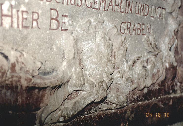 épitaphe (gravée, sur l'oeuvre, allemand) ; armoiries (en relief, sur l'oeuvre) ; inscription (gravée, allemand, sur l'oeuvre)