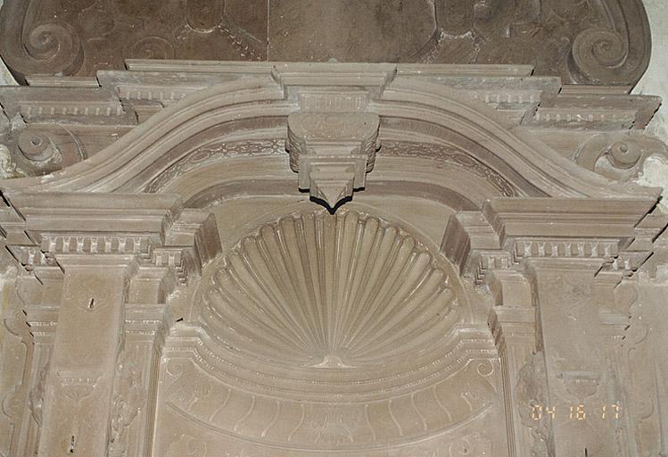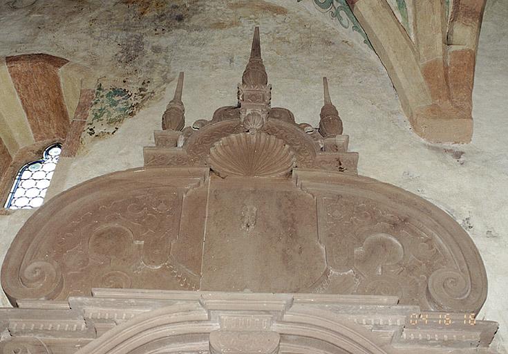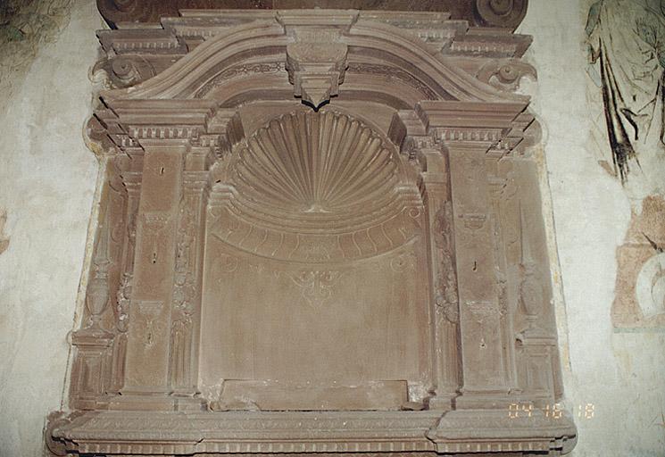 Plaque funéraire du comte Johann Friedrich von Rathsamhausen zum Stein (mort en 1582) réalisé au courant du 4e quart du 16e siècle. Sa date de décès partiellement illisible sur l'épitaphe est sujette à caution, néanmoins d'après des travaux historiques, il semble indubitable que le défunt soit bien mort cette année là. Elle a été restaurée en 2000, par l'entreprise colmarienne Schické. Cette plaque est une oeuvre extrêmement originale dans la typologie des monuments funéraires alsaciens de cette époque, par la qualité plastique de la sculpture, ainsi que par le décor supposé, qui était rapporté, constitué d'armoiries et de quatre statuettes figurant peut-être des vertus.