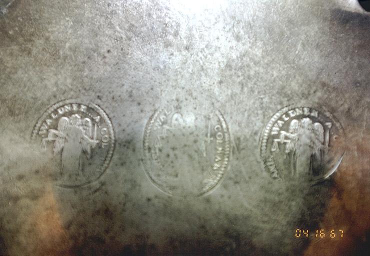 Le poinçon est insculpé trois fois sur le fond extérieur : dans un ovale, un saint Michel à longue tunique tient dans sa main droite une balance et dans sa main gauche une épée, avec sur le pourtour la légende DANIEL WALDNER A COLMAR.