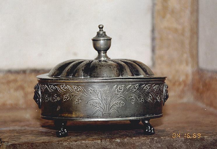 Boîte à hostie protestante de plan ovale. Elle repose sur des protomés de lion fondus et rapportés. Le corps comporte deux mufles de lion fondus et rapportés servant à la préhension. Le couvercle emboîtant à gros godrons comporte un bouton de préhension fondu et rapporté en forme d'urne.