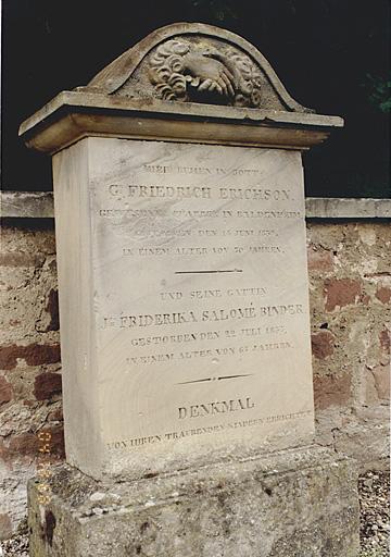 Transcription de l'épitaphe portée sur la face antérieure du monument : HIER RUHEN IN GOTT / / Gb. FRIEDRICH ERICHSON / GEWES[...] PFARRER IN BALDENHEIM. / GESTORBEN DEN 14 JUNI 1839. IN EINEM ALTER VON 70 JAHREN. / UND SEINE GATTIN / Jna FRIDERIKA SALOME BINDER / GESTORBEN DEN 22 JULI 1837, / IN EINEM ALTER VON 65 JAHREN / DENKMAL / VON IHREN TRAURENDEN KINDERN ERRICHTET. Transcription de l'inscription portée sur la face postérieure du monument : DOC ES IST NOCH / EINE RUH / WORDEN / INTER STERNEN LIGT EWIGKEIT / SEELIG SIND DIE IN DEM HEIM / WOLLENDEN / UNSER GLAUEBE LEHRT / UNSTERBLICHKEIT.